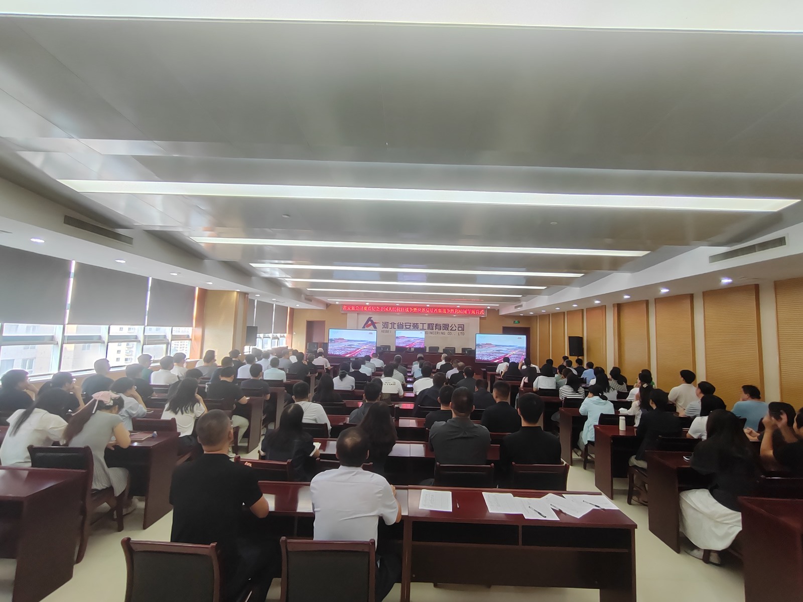 2025年9月3日,為紀(jì)念中國(guó)人民抗日戰(zhàn)爭(zhēng)暨世界反法西斯戰(zhàn)爭(zhēng)勝利80周年,河北省安裝工程有限公司積極組織職工集中觀(guān)看閱兵盛況直播。公司機(jī)關(guān)及各分公司、項(xiàng)目部共計(jì)2000余人通過(guò)多種方式同步參與,共同回顧歷史、緬懷先烈、展望未來(lái)。上午9時(shí),習(xí)近平總書(shū)記發(fā)表重要講話(huà),9時(shí)19分大閱兵正式開(kāi)始,公司機(jī)關(guān)及各分公司、項(xiàng)目部會(huì)議室座無(wú)虛席,職工們們整齊地坐在屏幕前,神情莊重地注視著電視畫(huà)面。在閱兵式過(guò)程中,